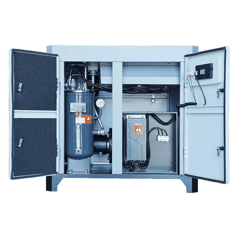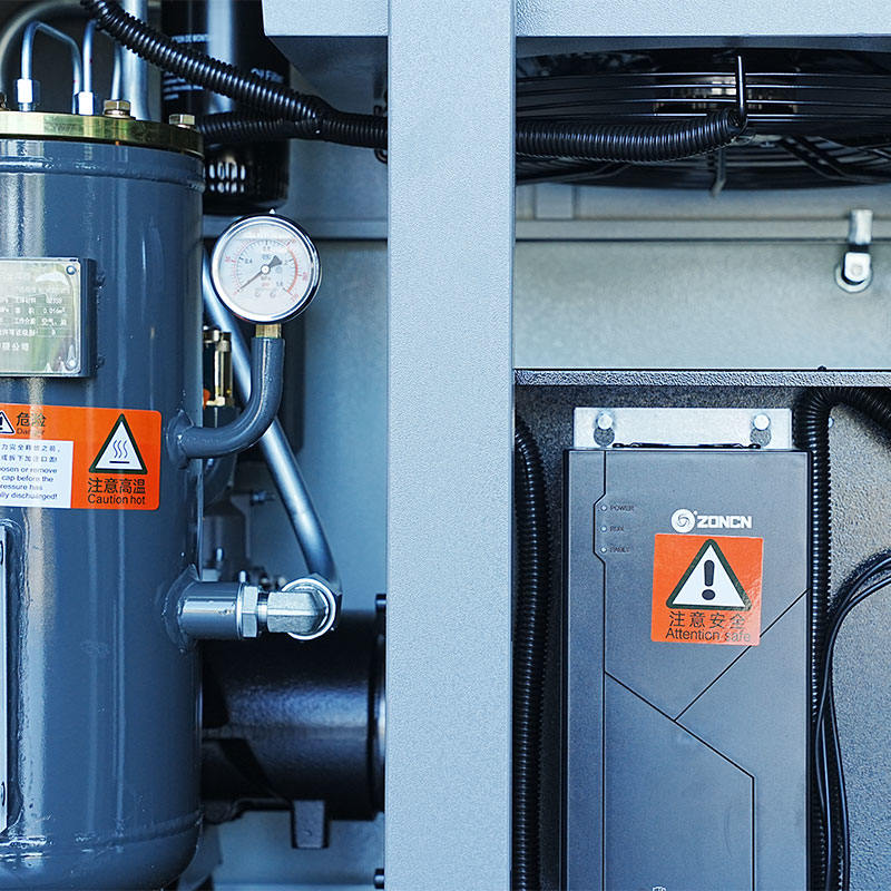 Sterowanie zmienną częstotliwością umożliwia dynamiczne dostosowywanie prędkości silnika do aktualnego zapotrzebowania na powietrze. W przypadku jednostopniowej sprężarki dwuślimakowej z mikroolejem o mocy 20 KM ta konfiguracja zwiększa elastyczność energetyczną, ponieważ sprężarka nie musi już pracować przy stałym obciążeniu. Zamiast tego przetwornica częstotliwości określa optymalną prędkość silnika wymaganą do zaspokojenia zapotrzebowania na przepływ powietrza, jednocześnie redukując niepotrzebne zużycie energii. Taka konfiguracja jest szczególnie korzystna w obiektach o zmiennym harmonogramie produkcji, różnorodnym obciążeniu sprzętu lub sporadycznym zużyciu powietrza. W połączeniu z chłodzonym olejem silnikiem synchronicznym z magnesami trwałymi firmy Zhejiang Haidebao Industrial Technology Co., Ltd., system zmiennej częstotliwości zapewnia płynne zmiany prędkości i kontrolowane zachowanie temperatury. Wielopoziomowe zarządzanie hałasem sprężarki dodatkowo wspiera pracę ze zmienną częstotliwością, zapobiegając nagłym zmianom dźwięku podczas regulacji prędkości.
